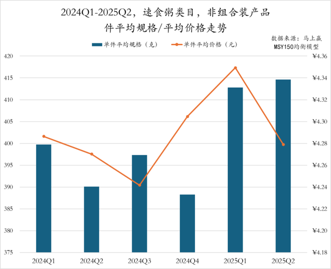 2024Q1至2025Q2期间,速食粥类目非组合装产品件均规格从2024年的390g——400g区间,逐步上行至2025Q2的近415克,为近六个季度最高值,产品规格先稳后升。件均价在2024Q1至Q3有所下滑,随后逐季上升至2025Q1的4.34元。2025Q2虽规格继续增长,但价格回落至4.28元,企业或正通过高性价比产品应对市场竞争。