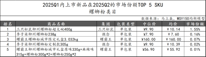 2025Q1上市的螺蛳粉类新品在2025Q2市场份额TOP 5 SKU,三只松鼠表现亮眼,其“柳州螺蛳粉超大碗400g”产品以1.55%的市场份额领先。其余四款新品来自微念和螺霸王集团。整体来看,螺蛳粉新品市场仍以头部品牌为主导,未来新品竞争或集中在规格创新和包装升级上。