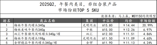 2025Q2,午餐肉类目非组合装产品Top 5 SKU由光明肉业、中粮、双汇和金锣四大集团组成。光明肉业凭借两款不同规格的梅林午餐肉罐头,市场份额合计达到25.64%,继续保持明显的领先优势。中粮旗下的梅林美味午餐肉位列第二,双汇和金锣各有一款产品位列前三和第五。