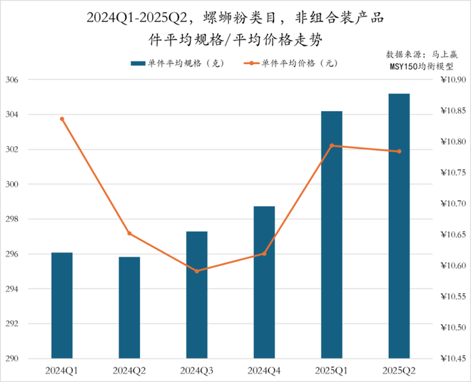2024Q1至2025Q2,螺蛳粉类目非组合装产品的件均规格稳步提升,从2024Q1的296g稳步上涨至2025Q2的305g,尤其是2025Q1实现跳升。而件均价整体呈现“U”型变化趋势,2024Q1至Q3逐步回落至10.6元的阶段性低点,随后两个季度回升至10.8元,2025Q2保持稳定。企业在保证产品规格提升的同时,价格策略趋于稳健,发展态势良好。