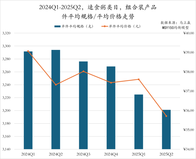 组合装产品方面,近六个季度速食粥类目的件均规格和件均价整体呈现“量价齐降”的调整趋势。件均规格除2024Q2有小幅提升外,从2024Q1的3290g缩减到2025Q2的3200g,件均价也从39元波动下滑至不足36元,尤其是2025Q2下滑明显。