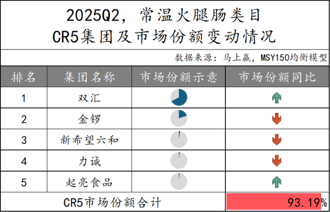 2025Q2,常温火腿肠市场的CR5集团由双汇、金锣、新希望六和、力诚及起亮食品组成,合计占据93.19%的市场份额,市场高度集中,仅双汇一家在类目中的市场份额就超过60%。从市场份额的变化情况来看,双汇在市场份额第一的情况下同比有所增长,起亮食品也呈增长态势。而金锣、新希望六和、力诚的市场份额则出现下滑。