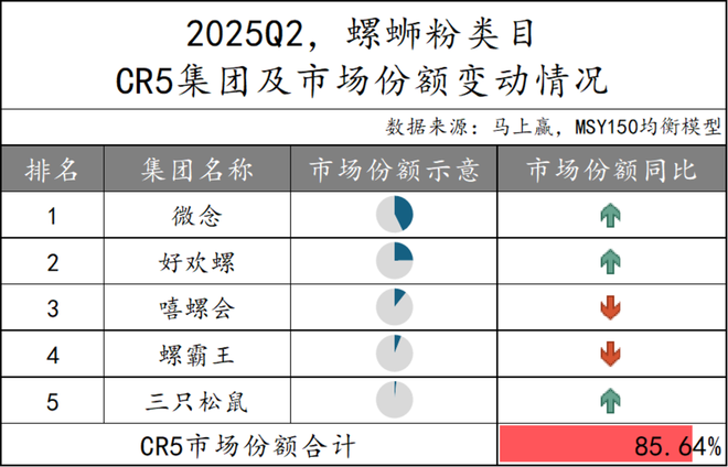 2025Q2螺蛳粉类目的 CR5 集团市场份额合计为 85.64%,市场集中度处于较高水平。具体来看,微念和好欢螺位居前两名的同时市场份额同比增长,而嘻螺会和螺霸王则出现下滑。值得关注的是,三只松鼠在本季度首次进入CR5集团之列,取代了柳全跻身CR5集团。