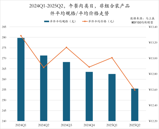2024Q1至2025Q2,午餐肉类目非组合装产品持续呈现出“规格缩减、价格变低”的趋势。件均规格从2024Q1的280g逐季下滑至2025Q2的255g。价格方面,件均价在2024年整体围绕13元波动,2025年虽短暂回升至13元,但2025Q2再次下探至12.6元,创下近六个季度最低点。在便捷、轻量化消费趋势驱动下,传统大罐装午餐肉产品受限于食用频次低、储存不便等问题,逐渐被单片装、小克重包装所替代,品牌正通过“小规格+低价位”的组合策略应对当前市场消费偏好转变。