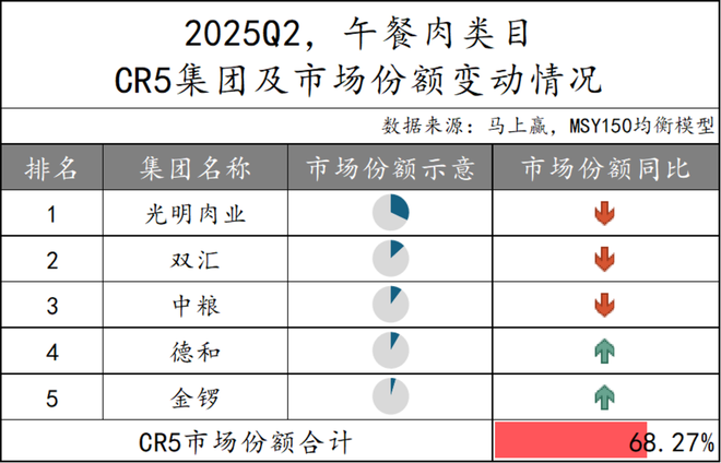 2025Q2,午餐肉类目 CR5 集团市场份额合计为 68.27%。光明肉业跃升榜首,或是凭借优质原料及健康、特色口味产品赢得消费者青睐,但市场份额同比有所下滑。双汇、中粮紧随其后,市场份额也呈下降态势。而德和及金锣的市场份额则有所增长。