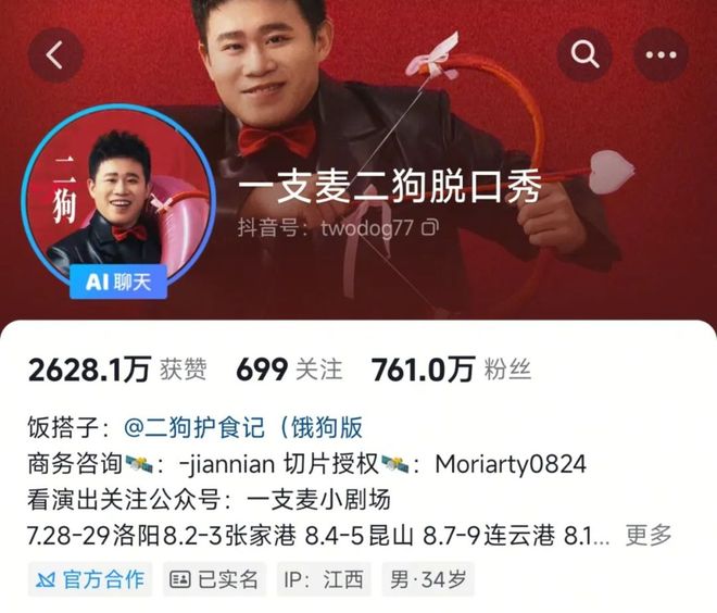 第三种则是擅长运营短视频账号,用互动切片为线下引流的俱乐部。例如南昌的脱口秀演员“一只麦二狗”,在抖音平台上拥有超过760万粉丝,其账号发布的互动切片合集《不养闲人系列》,单系列播放量达6.4亿。而在今年,“二狗”已经开启覆盖20个城市的全国巡演,单场观众规模上千人。