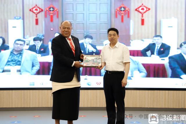 汤加卫生部首席执行官奥法努阿(右二)、中国驻汤加大使刘为民(左三)线上发表致辞