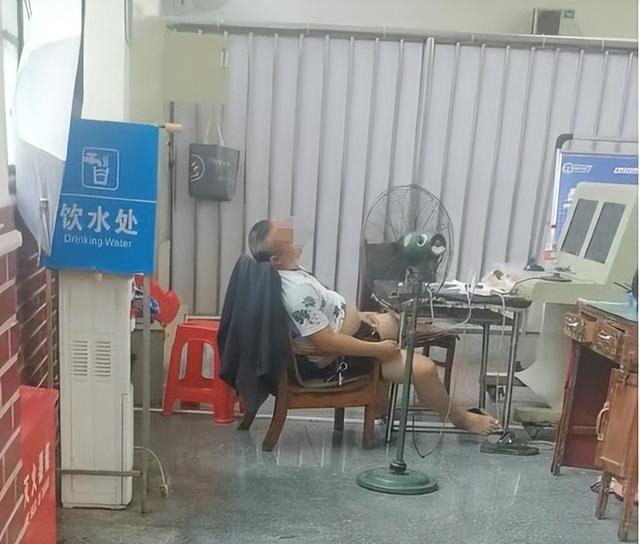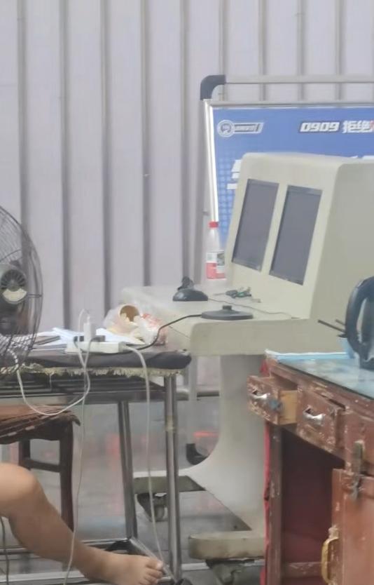 网友发布的现场视频显示,一名穿着短裤的男子吹着电风扇,坐在工作岗位的椅子上仰着脑袋似乎睡着了,旁边的安检机疑似无人值守。