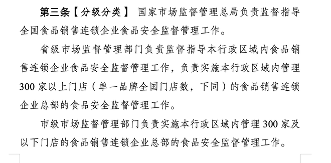 《意见稿》第三条指出,省级市场监督管理部门负责监督指导本行政区域内食品销售连锁企业食品安全监督管理工作,负责实施本行政区域内管理300家以上门店(单一品牌全国门店数,下同)的食品销售连锁企业总部的食品安全监督管理工作。市级市场监督管理部门负责实施本行政区域内管理300家及以下门店的食品销售连锁企业总部的食品安全监督管理工作。县级市场监督管理部门负责实施本行政区域内食品销售连锁企业的分支机构、门店的食品安全监督管理工作。