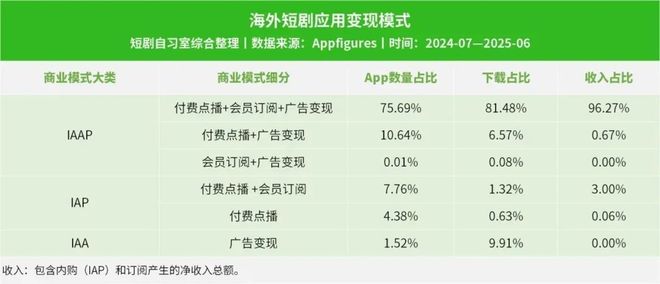 事实上,短剧已初步探索出一套适用于海外的商业模式。目前,短剧出海的主流变现模式有三大类:IAAP(混合变现)、IAP(应用内购买)和IAA(应用内广告)。而这三种模式又可以进一步细分为六种路径,其中IAAP可分为“付费点播+会员订阅+广告变现”、“付费点播+广告变现”、“会员订阅+广告变现”;IAP可分为“付费点播+会员订阅”、“纯付费点播”;IAA则是“纯广告变现”。
