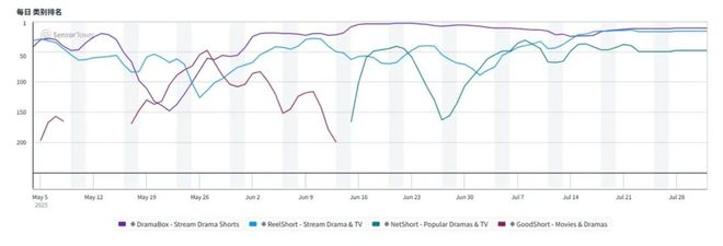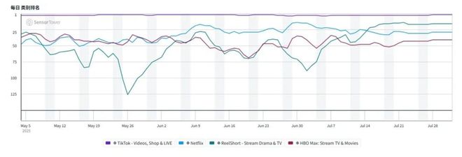 首先是下载量。文娱先声翻看了ReelShort近3个月的下载排名,的确发现了一些端倪。对比TikTok这样的“真国民应用”,以及Netflix和HBO这样的传统流媒体平台,ReelShort的下载排名波动极大,其中最高为7月22日的第14名,最低为5月26日的第126名。