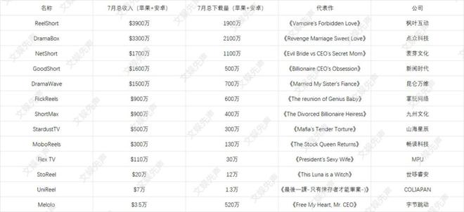 文娱先声盘点了上述平台7月的总收入和总下载量。当下,ReelShort和DramaBox处于海外短剧平台中的第一梯队,其月收入达3000万+美元级别,月下载量更是一度超越Netflix和HBO,与其他竞争者拉开显著差距。