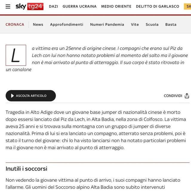因始终没有在着陆点见到这名青年,他的同伴立即发出了警报。瓦尔巴迪亚(Alta Badia)高山救援队的队员迅速出动,在该区域上空搜寻,最终在一处峡谷中发现了这名青年的遗体。