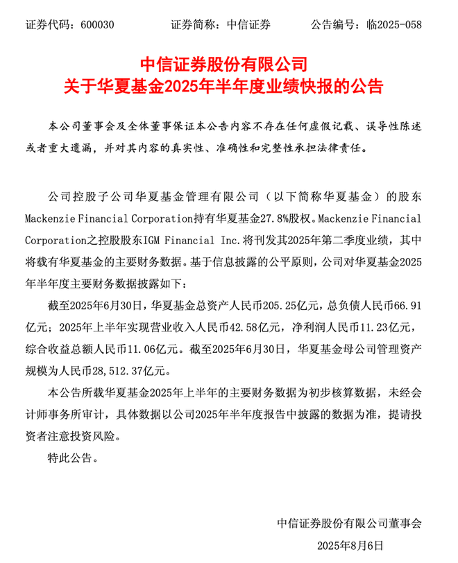 8月6日晚间,华夏基金股东中信证券股份有限公司(下称“中信证券”,600030)发布关于华夏基金2025年半年度业绩快报的公告。