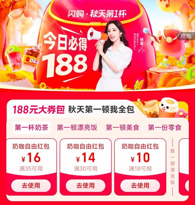 淘宝·闪购频道也推出了以“秋天第一顿我全包”为噱头的“188元大券包”活动,分别在“第一杯奶茶”“第一顿漂亮饭”“第一顿美食”等类目下发放优惠券。