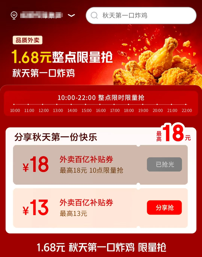 另外,京东·秒送频道也推出了“秋天第一口炸鸡”的活动,用户可在整点限时限量抢最高18元的优惠券。