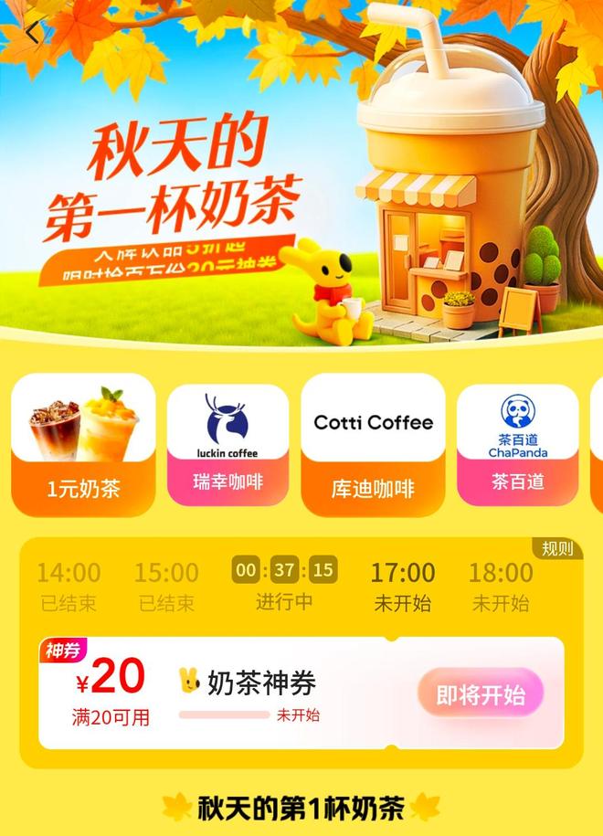 红星资本局注意到,美团推出“秋天的第一杯奶茶”活动,用户可在活动当天的10个整点抢大额“20元-20元”的神券,神券当天有效。