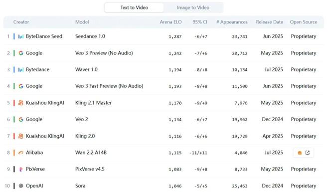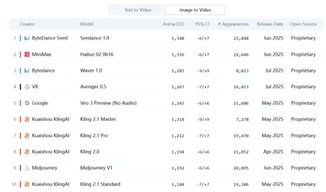 值得一提的是,榜单上除了有阿里、字节等互联网大厂,minimax、爱诗科技等创业公司也赫然在列,且国内厂商的出现率明显略高于国外厂商。