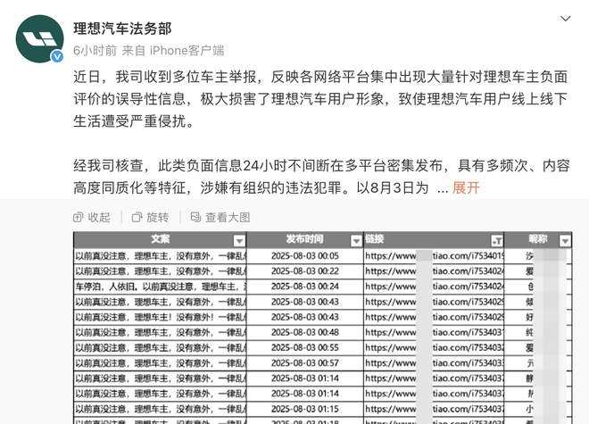 8月7日,理想汽车法务部发文称,近日网络平台上出现针对理想车主的负面评价,致使车主们的生活受到严重侵扰。经核查,此类负面信息24小时不间断在多平台密集发布,具有多频次、内容高度同质化等特征,涉嫌有组织的违法犯罪。