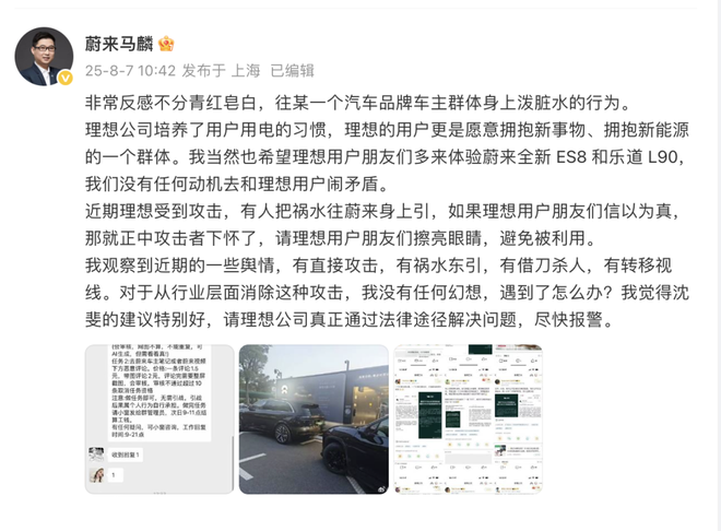 他写道,“非常反感不分青红皂白,往某一个汽车品牌车主群体身上泼脏水的行为。”“近期理想受到攻击,有人把祸水往蔚来身上引,如果理想用户朋友们信以为真,那就正中攻击者下怀了。”