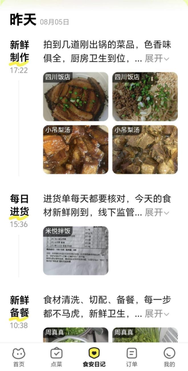 除此之外,浣熊食堂还在建设透明后厨上下了不少功夫,比如其小程序中有一栏为“食安日记”,专门记录商家培训、产品制作过程以及后厨环境等。