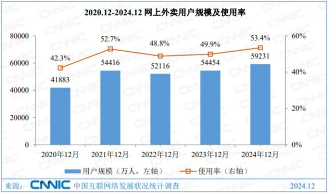 据中国互联网络信息中心(CNNIC)相关报告:截至2024年12月,我国网上外卖用户规模达5.92亿人,占网民整体的53.4%。不过较2021年的5.44亿人相比,年化增速仅为2.85%。