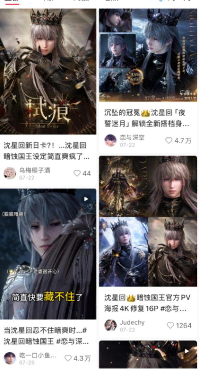 7 月 25 日,《恋与深空》"沈星回・暗蚀国王" 限定卡池上线首日便登顶 iOS 畅销榜,单日流水突破 3000 万元。这份成绩单背后,是玩家对 "一年仅一次的大型活动" 的热切期待 —— 从 7 月 22 日先导 PV 发布起,玩家自发组织的宣传活动在微博、小红书等平台形成刷屏效应,# 沈星回暗蚀国王 #话题阅读量 48 小时内破 8000 万。