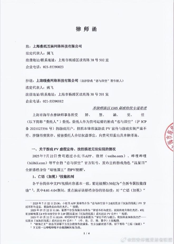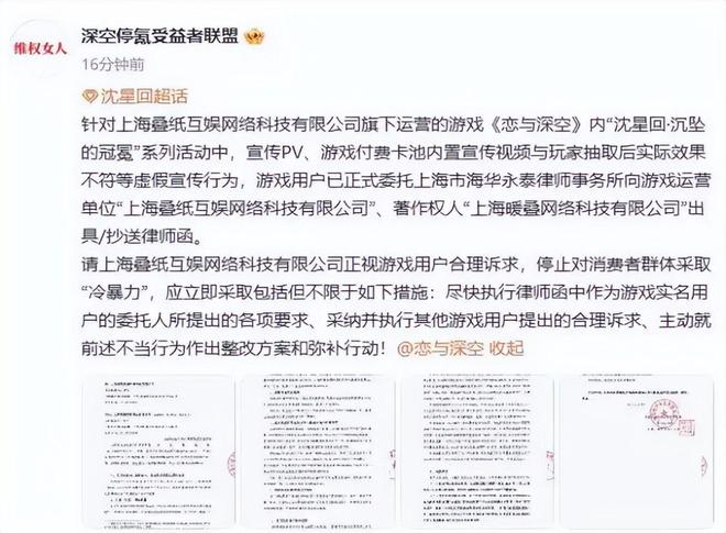 更具标志性的转折发生在 8 月 6 日 ——"深空停氪受益者联盟" 委托上海市海华永泰律师事务所出具的律师函,首次将争议定性为 "消费欺诈"。律师函明确指出,叠纸在明知 PV 内容无法实装的情况下,仍以此诱导玩家消费,已违反《消费者权益保护法》第五十五条关于 "退一赔三" 的规定。