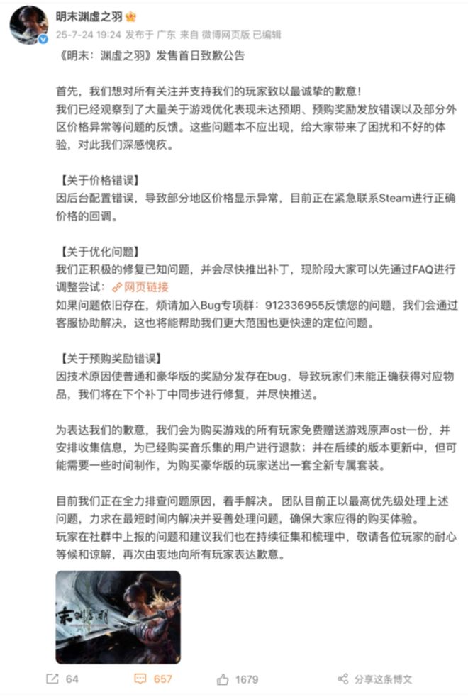 近期发售的单机游戏《明末·渊虚之羽》,发售首日,就遭到大量差评和投诉,游戏开发商即对外发布致歉公告,此后又连续发布三条致歉和版本更新公告,承诺对玩家不满的功能进行更改和修复。