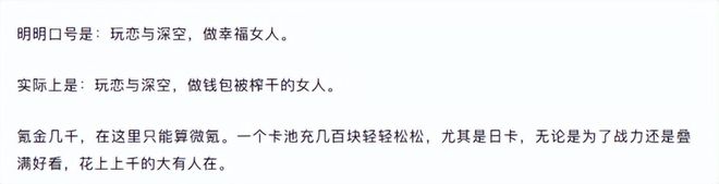 玩家在《我从最圈钱的乙游恋与深空中看人生》文章里开头写:“玩了一段时间的《恋与深空》后,一直觉得,能想出《恋与深空》的抽卡、星普、养队伍、叠卡、升级机制还有社群运营的简直是个圈钱的天才。”