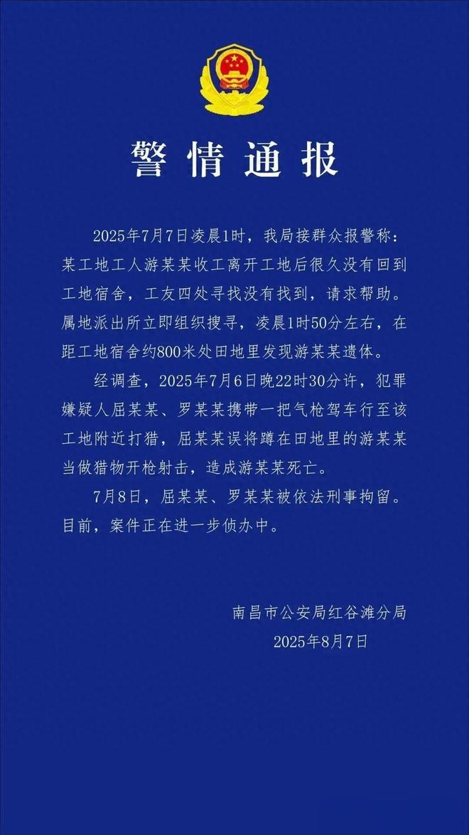 当一起突如其来的死亡打破夏夜的平静,一个家庭的支柱轰然倒塌,留下的不仅是未竟的生计,还有关于责任与法理的重重追问。2025年7月,江西南昌红谷滩区的一处工地旁,湖南娄底籍农民工游某某的生命永远停在了那个夜晚,而这一切的起因,竟是一场荒唐的打猎误杀。