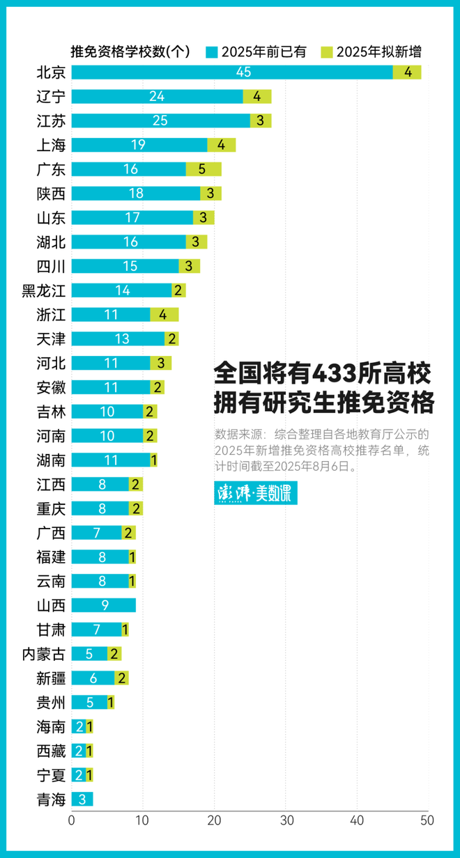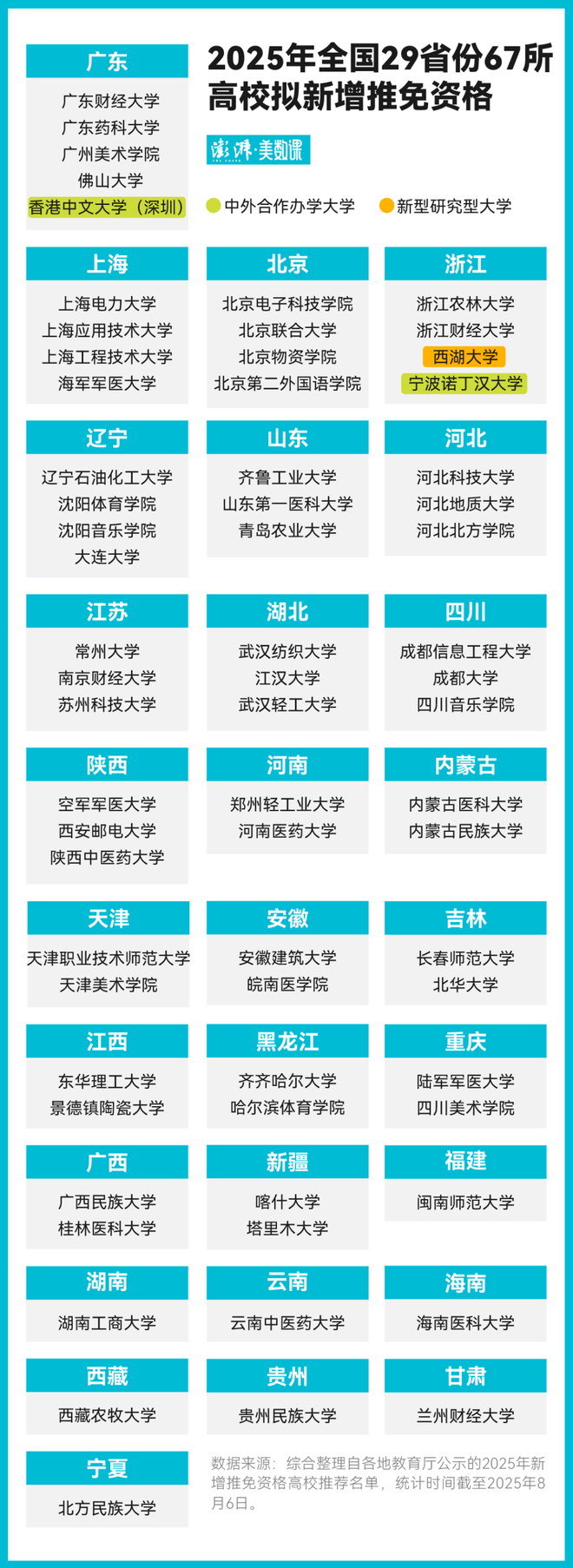 从7月下旬黑龙江、云南等省份公示新增推免资格高校拟推荐名单开始,多个省份已陆续公布了2025年的拟推荐名单。