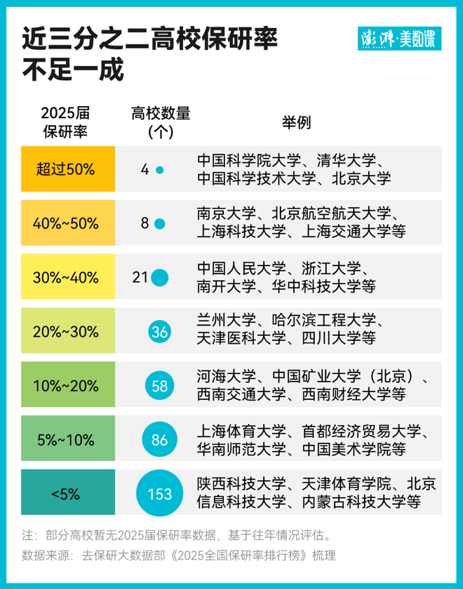 而从2025届的保研率数据看,除了清华、北大等少数名校的推免比例超过50%,多数“双一流”高校的保研率不超过30%,其余非“双一流”高校的保研率绝大多数是在10%甚至5%以下。