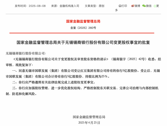 8月8日,国家金融监督管理总局披露的批复显示,同意无锡国联受让红豆集团持有的锡商银行5亿股股份。受让后,无锡国联合计持有锡商银行5亿股股份,持股比例为25%。批复的落款时间是4月25日。