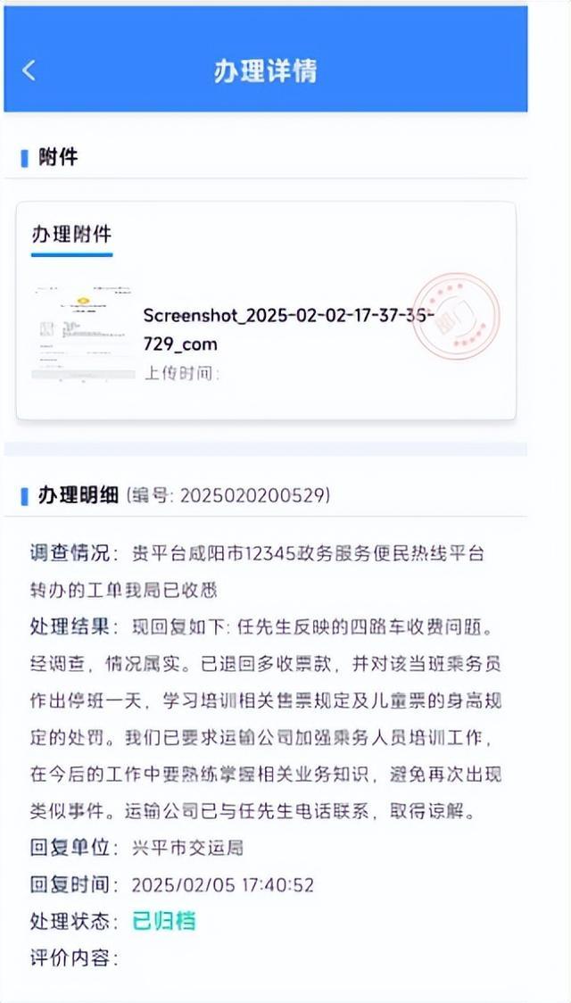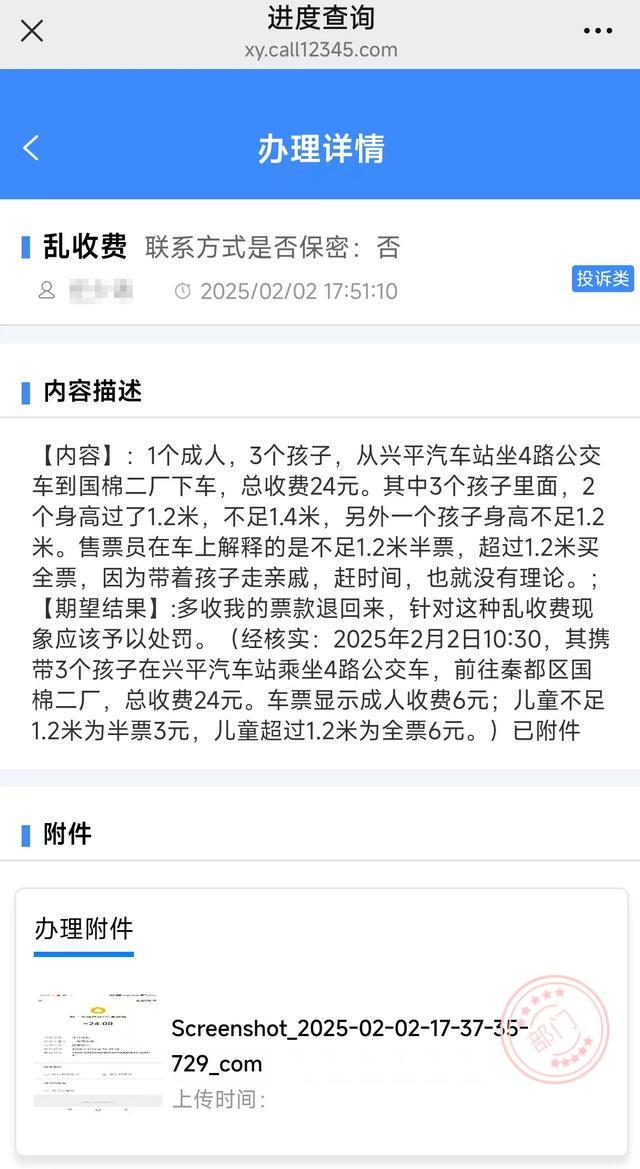 在任先生的12345记录中,任先生反映,2月2日上午10时30分,1名大人3名小孩,在兴平汽车站乘坐4路公交车,前往咸阳市秦都区国棉二厂下车,一个孩子1.2米以下,两个孩子身高在1.2~1.4米,4人票价均按成人票价6元收取。
