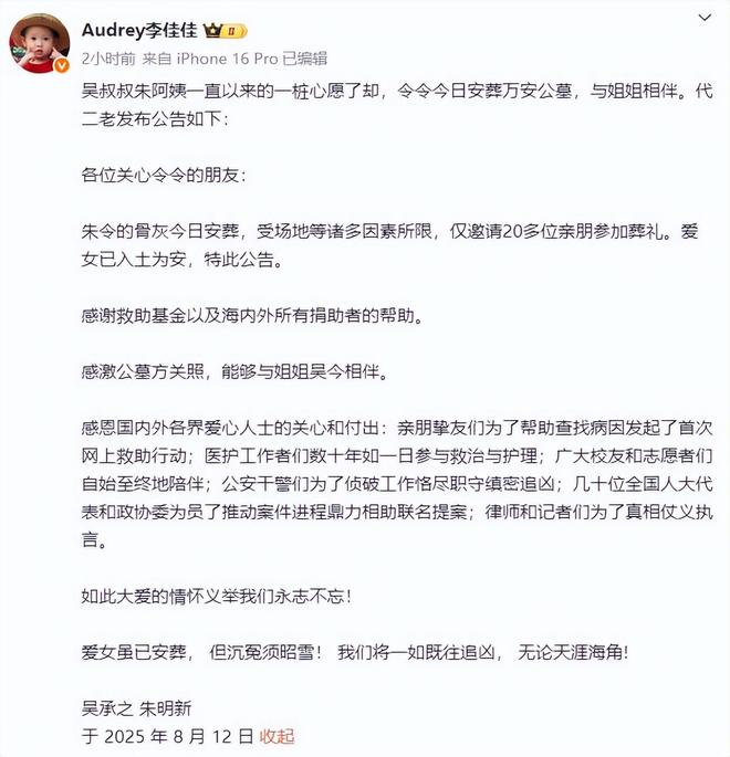 值得一提的是,在案件调查中起到关键作用的陈震阳教授,如今已88岁高龄,依然精神矍铄。正是他在1995年顶住压力完成的铊检测,为案件定性奠定了基础。而朱令父母吴承之、朱明新,在经历女儿病危的奔波后,身体已极度虚弱,但他们在葬礼公告中仍坚定表示:“爱女虽已安葬,但沉冤须昭雪!”