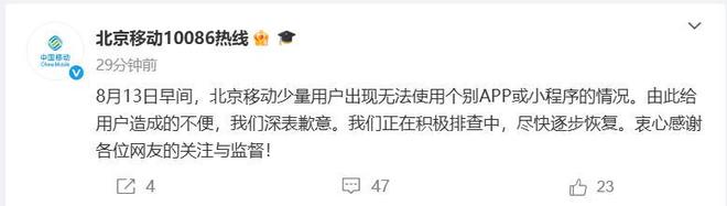@北京移动10086热线 发文称:8月13日早间,北京移动少量用户出现无法使用个别APP或小程序的情况。由此给用户造成的不便,我们深表歉意。我们正在积极排查中,尽快逐步恢复。衷心感谢各位网友的关注与监督!