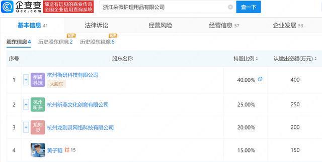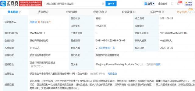 企查查APP显示,浙江朵薇护理用品有限公司成立于2021年6月,法定代表人为徐嘉斌,注册资本1000万人民币,经营范围包含卫生用品和一次性使用医疗用品生产、卫生用品和一次性使用医疗用品销售、纸制品制造等。企查查信息显示,该公司由杭州衡研科技有限公司、杭州昕燕文化创意有限公司、杭州龙则灵网络科技有限公司、黄子韬共同持股。