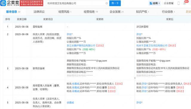 值得一提的是,近日,黄子韬卫生巾品牌旗下杭州朵薇卫生用品有限公司发生工商变更,企业名称变更为杭州宏领卫生用品有限公司,同时,多位主要人员均发生变更,浙江朵薇护理用品有限公司退出股东行列。