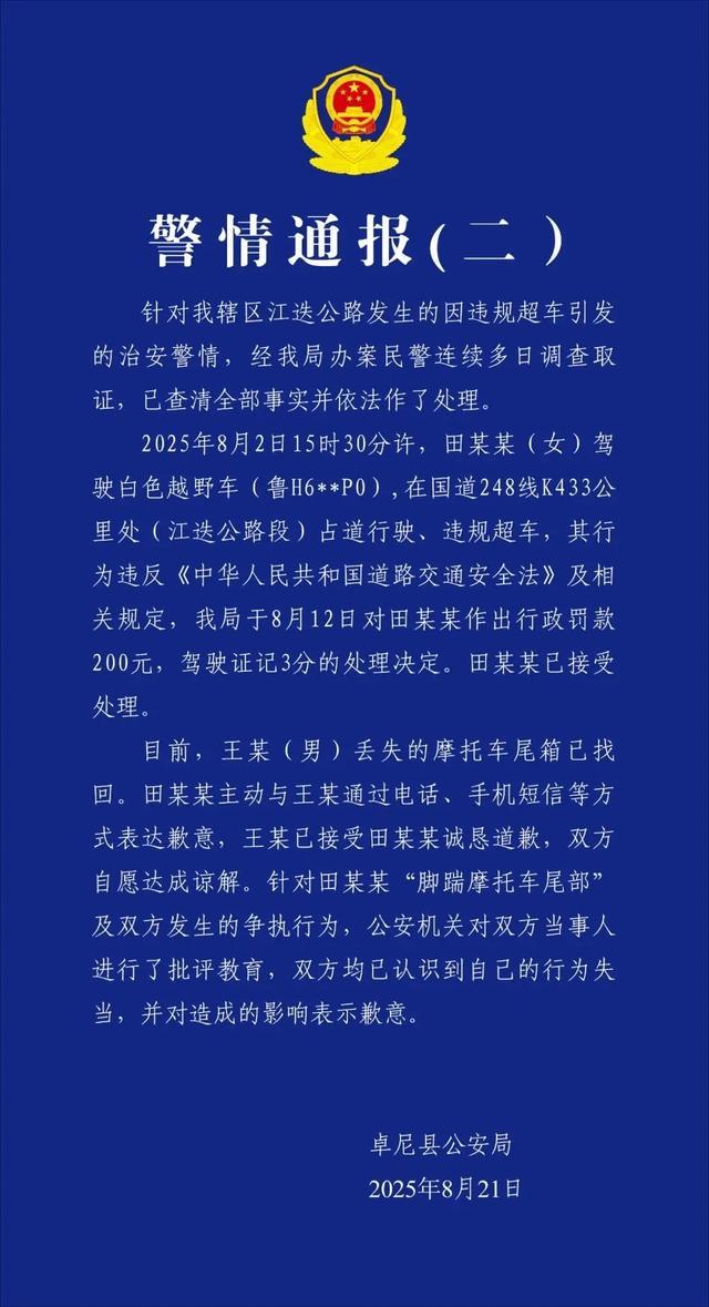 8月21日,甘肃卓尼县公安局针对“女子开奔驰逼停摩托车并下车猛踹其尾箱”一事再发警情通报: