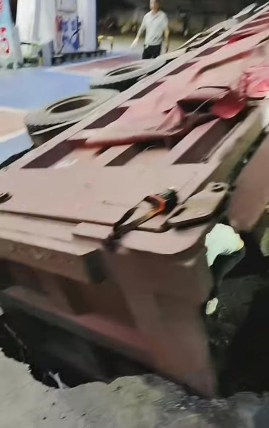 疑掉头运输车压塌路面整体陷2米深坑侧翻