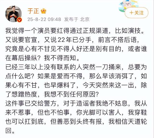 于正的否认引发许荔莎强烈反应。22日9:17,许荔莎发布微博,表示于正撒谎,“从现在开始我说的每一句话都是真的。”