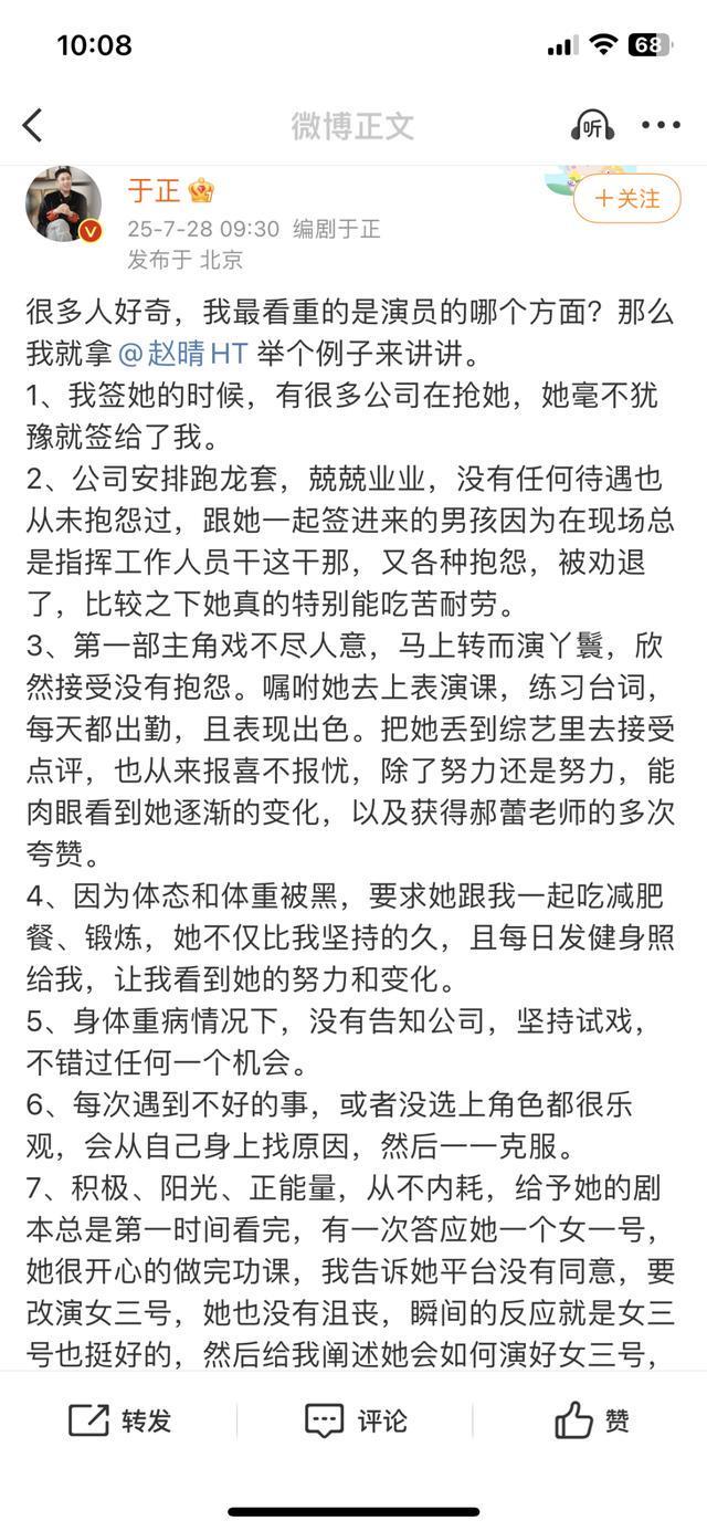 值得一提的是,赵晴也是于正公司的艺人,且为于正当下正在力捧的女演员。光是8月份,于正就为赵晴发送过4条宣传微博。7月28日,于正曾为赵晴发千字表扬长文,表示她工作兢兢业业,努力健身,积极阳光正能量。
