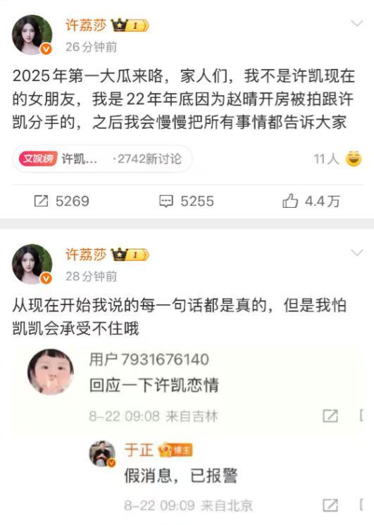 22日上午9:10,于正在微博评论区回复网友,提到许凯单身,有关许凯许荔莎恋情的消息为“造谣”,并表示两人21年拍戏时期有短暂交际,“早已无联系,聊天记录均为伪造,我方已报警。”