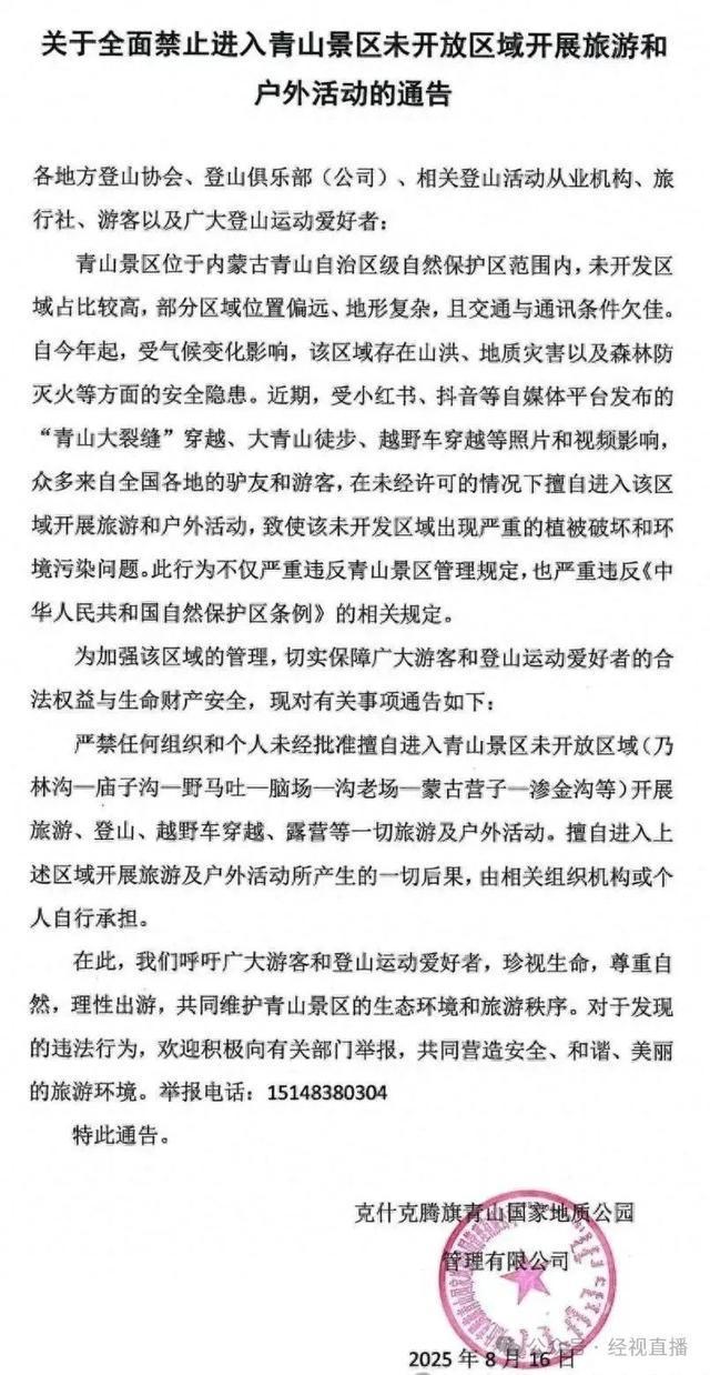 青山景区位于内蒙古青山自治区级自然保护区范围内,近期因网络平台传播的“青山大裂缝”等徒步路线信息,吸引了大量游客擅自进入未开放区域,造成植被破坏、环境污染。部分区域因地形复杂、通讯不便,且受气候变化影响,存在山洪、地质灾害等安全隐患。