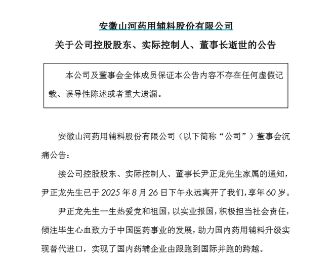红星资本局8月27日消息,今日,山河药辅(300452.SZ)发布公告称,公司控股股东、实际控制人、董事长尹正龙于2025年8月26日下午逝世,享年60岁。