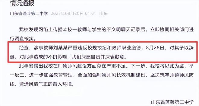 事件的起因,是蓬莱二中中年男教师刘某某与女学生不雅聊天被家长发现。家长在得知情况后,随即向学校及相关部门反映,并未选择隐忍。这一举报很快引发校方重视,在核实相关情况后,蓬莱二中迅速作出决定:解除与刘某某的聘用合同,并发布正式通报,明确其行为“严重违反教师职业道德规范”。短短八个字的定性,在教育行业内意味着对教师身份的彻底否定,也让这起原本局限于校园内的事件,迅速突破地域限制,登上网络热搜。