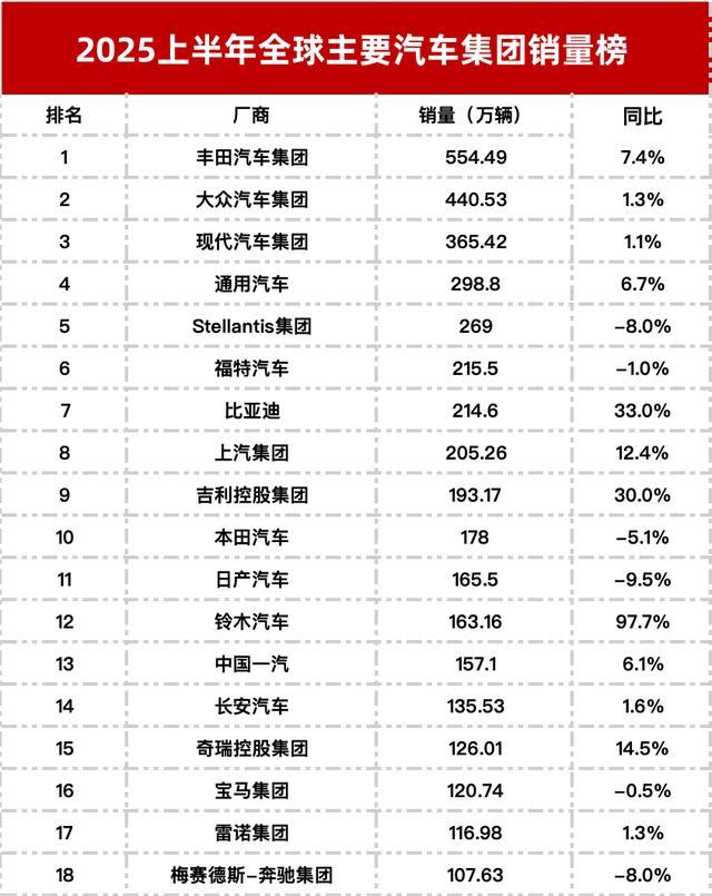 作为中国最大的汽车制造商之一的比亚迪,今年上半年以214.6万辆超越本田和日产,在全球销量排名中跃升至第七名。上汽集团、吉利控股分别排在第八、九名,上半年销量均实现两位数增长,分别为205.26万辆和193.17万辆。本田上半年全球销量同比下滑5.09%至178万辆,位列第十。日产汽车则同比下滑9.51%至165.5万辆,排名跌出前十。