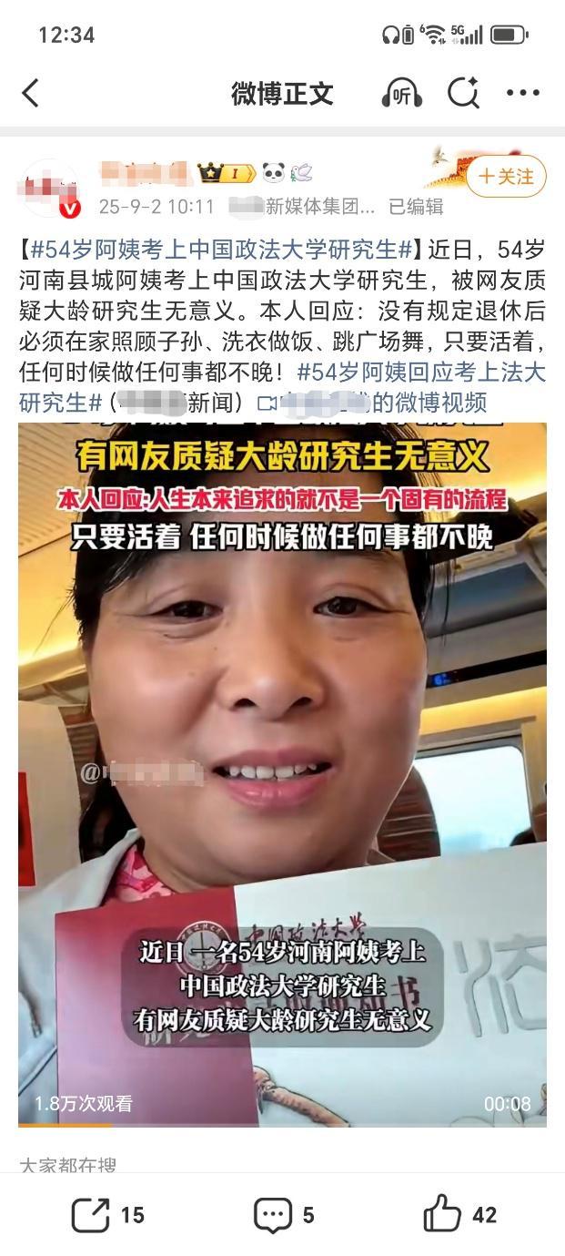 于是,一则“54岁河南阿姨考上中国政法大学硕士研究生”的励志故事就“建构”完成并在社交媒体平台上广泛传播开来。