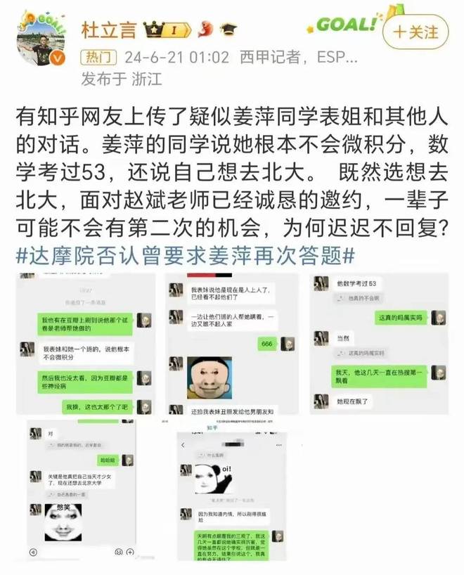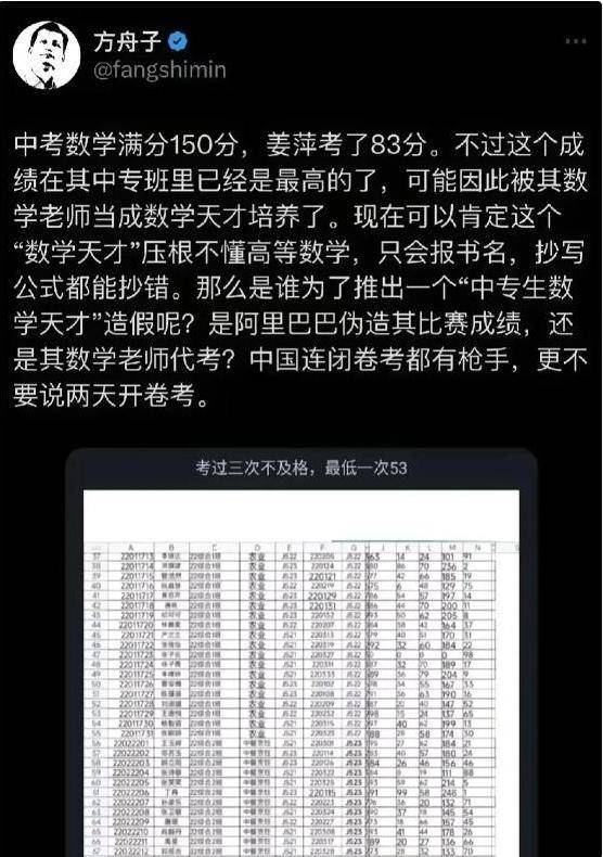 随着讨论升温,更多不利于姜萍的信息被曝光。她的同班同学晒出成绩单,显示其日常数学成绩曾低至51分,称“她的数学只是比少数同学好一点,离‘天才’差得远”;另有知情者透露,姜萍没有个人电脑,平时学习都要借同学的电脑,“连设备都没有,怎么完成需要大量计算和排版的竞赛题目?”